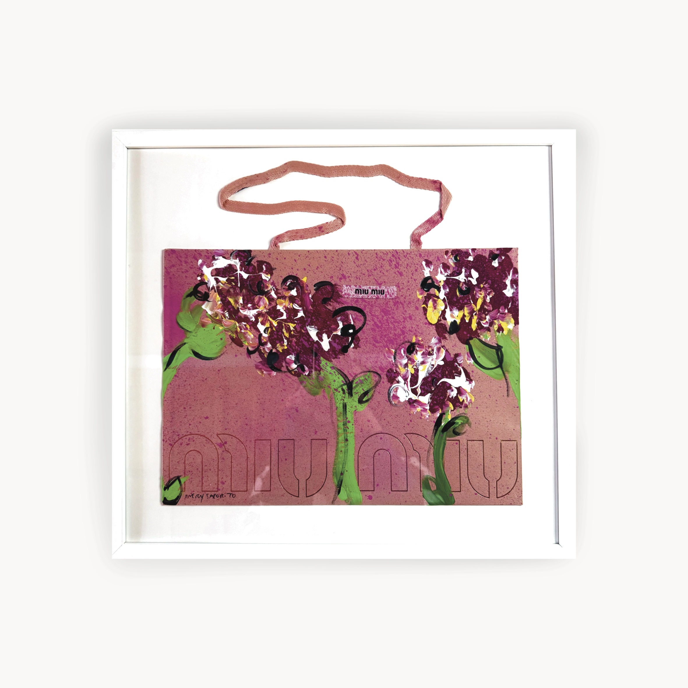 I fiori non sono solo un elemento decorativo, ma simboleggiano il modo in cui ha conquistato il suo spazio nel mondo del lusso con la sua arte, senza dover comprare il prestigio, ma meritandolo con il suo talento. Attraverso l’iconico volto che contraddistingue il suo stile e l’aggiunta di fiori, Mery Saporito trasforma questi elementi in un manifesto visivo della sua affermazione artistica. I fiori, emblema di rinascita e compiutezza, rappresentano il raggiungimento di un traguardo dopo anni di incomprensione, il segno di una fioritura che va oltre il riconoscimento esteriore per affermarsi come una crescita interiore.